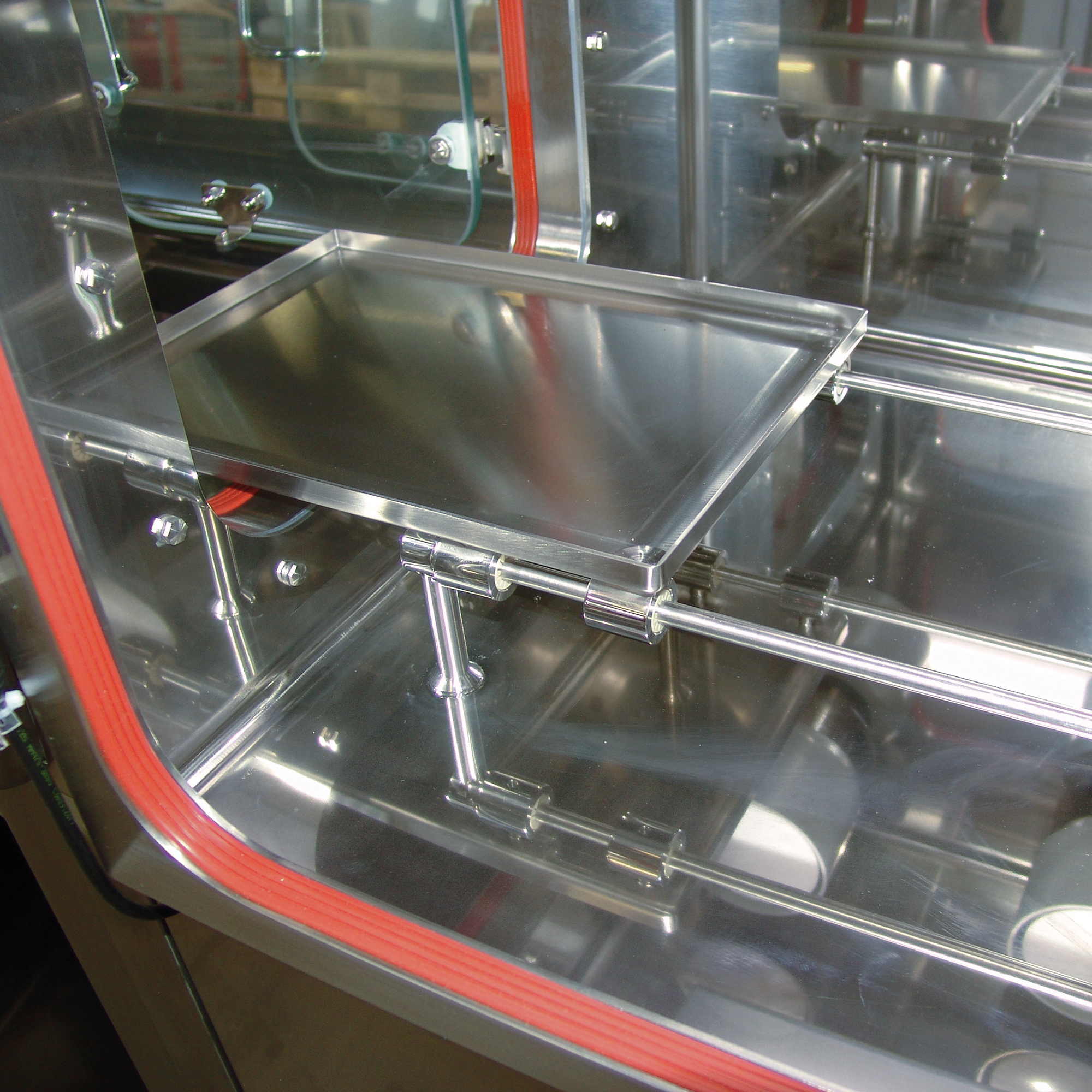 The front wall can be opened completely and is equipped with an opening handle, gas springs to balance the weight and perimeter inflatable gaskets made of pharmaceutical grade FDA-approved silicone. The wall can be tilted 6° in order to have a better view of within.