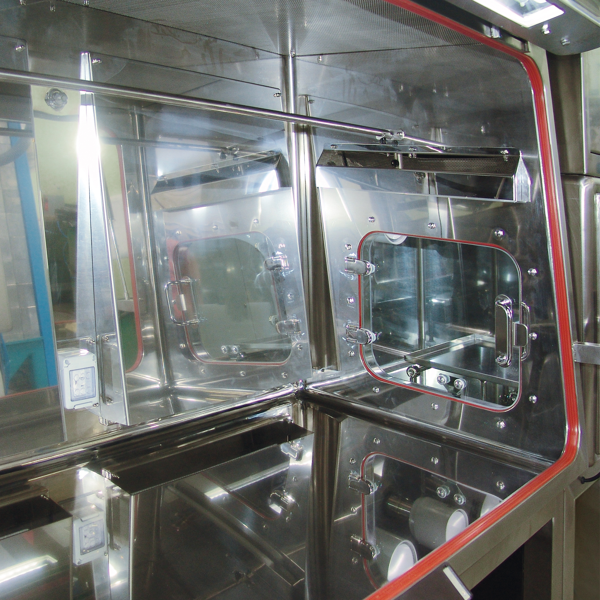A second door, equipped with the same tightness system, connects the pre-chamber with the work chamber.